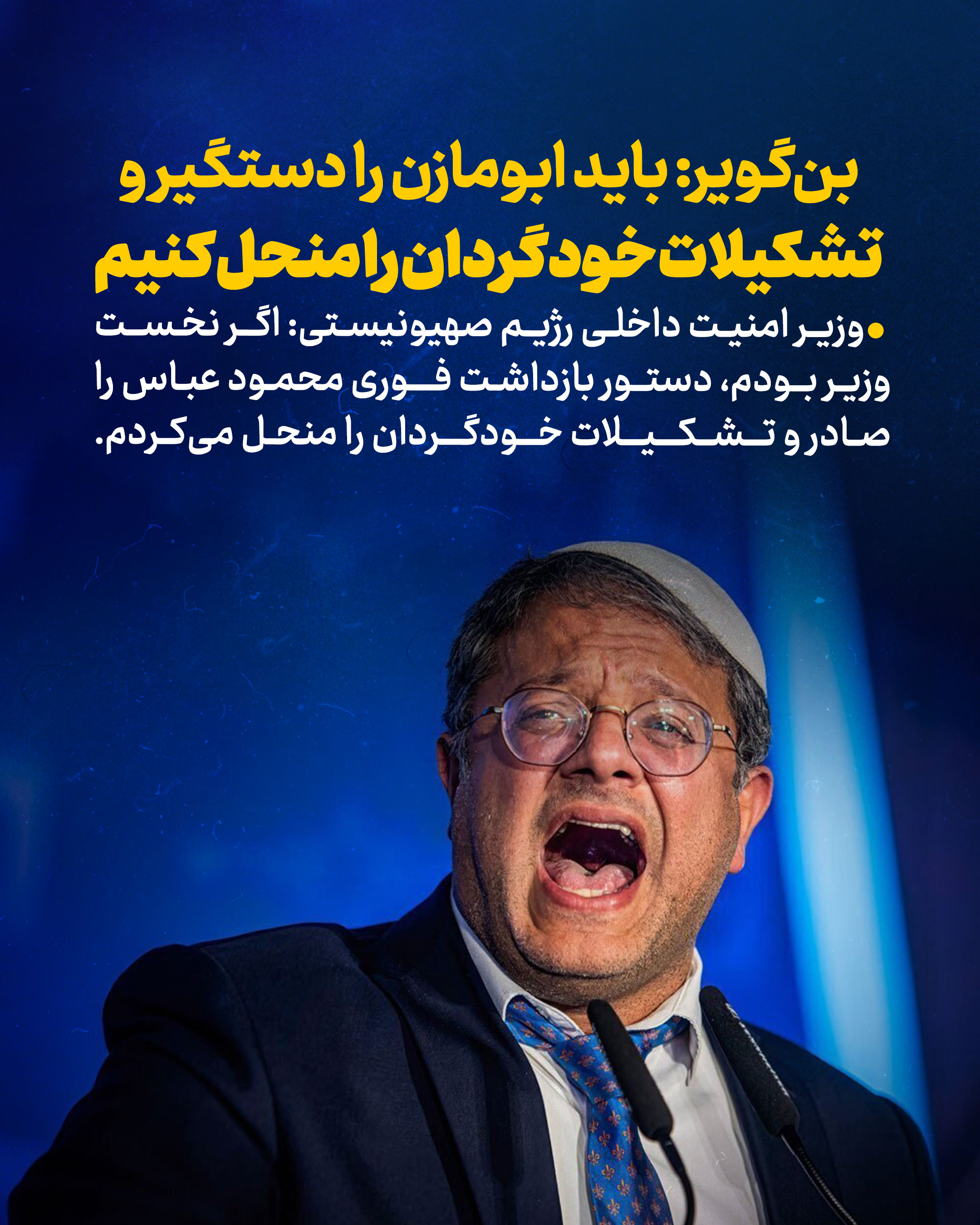 بن گویر: باید ابومازن را دستگیر و تشکیلات خودگردان را منجل کنیم
