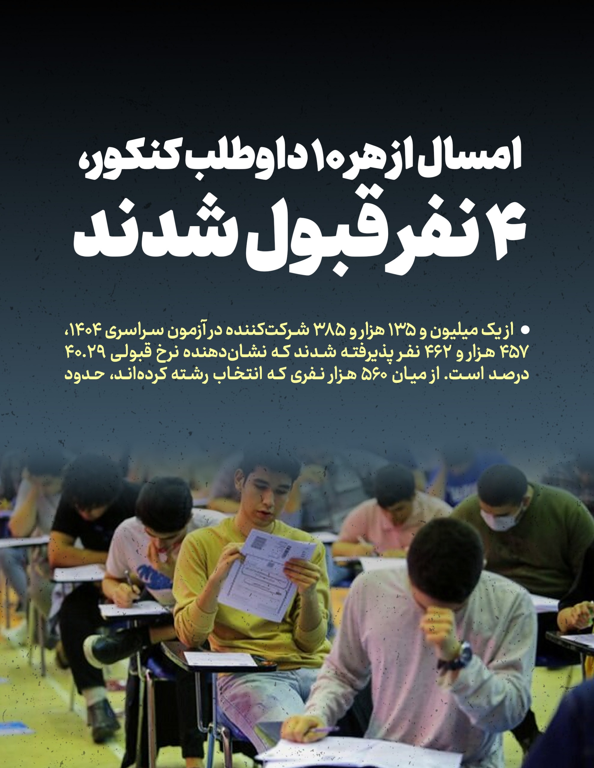 امسال از هر ۱۰ داوطلب کنکور، ۴ نفر قبول شدند