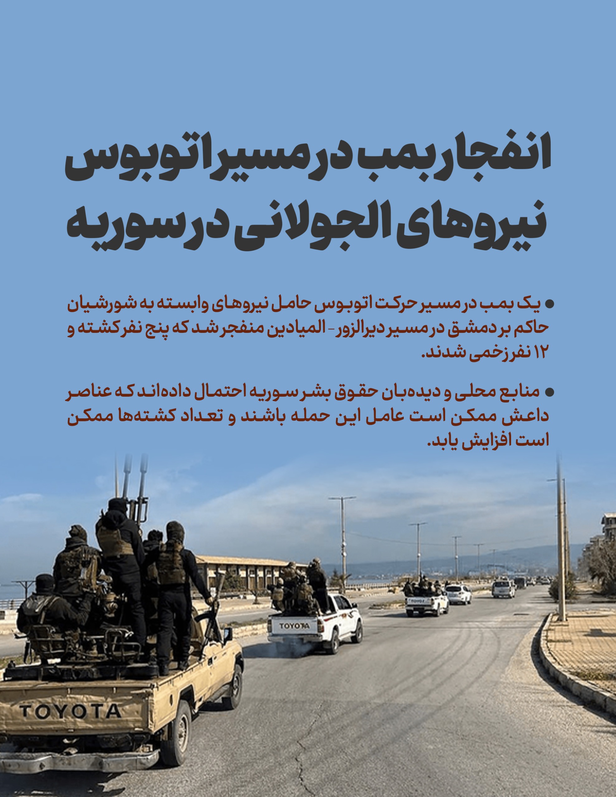 انفجار بمب در مسیر اتوبوس نیروهای الجولانی در سوریه