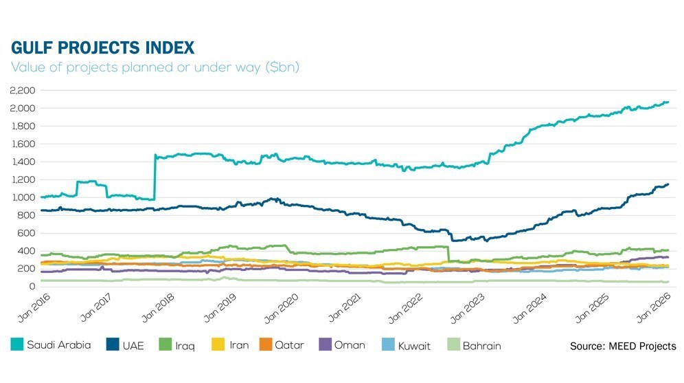 بر اساس این آمار، عربستان سعودی با بیش از ۲۱۰۰ میلیارد دلار پروژه برنامه ریزی شده و در دست اجرا، همچنان صدرنشین کشورهای منطقه خلیج فارس از این نظر است. امارات متحده عربی با ۱۱۵۰ میلیارد دلار پروژه برنامه ریزی شده و در دست اجرا، جایگاه دوم منطقه را به خود اختصاص داده است.