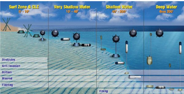 مین‌های لنگردار: این نوع مین‌ها معمولاً در عمق‌های ۳ تا ۵۰ متر عملیاتی هستند و با بهره‌گیری از حسگرهای ضربه‌ای و فشار، برای ایجاد محدودیت حرکت شناورها و افزایش ریسک عملیاتی ناوگان‌های متخاصم به کار گرفته می‌شوند.