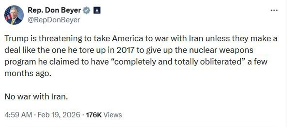 دان بایر نماینده دموکرات ایالت ویرجینیا در مجلس نمایندگان آمریکا با انتشار پستی در شبکه اجتماعی ایکس نوشت: ترامپ تهدید میکند که آمریکا به جنگ با ایران خواهد رفت مگر اینکه آنها توافقی مانند توافقی که او در سال ۲۰۱۸ پاره کرد را امضا کنند تا برنامه هستهای خود را که چند ماه پیش ادعا میکرد کاملا و تماما نابود کرده، رها کنند.