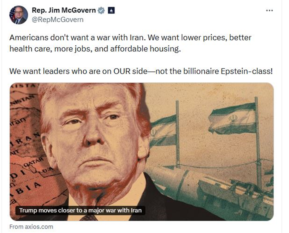 جیم مکگاورن نماینده دموکرات ایالت ماساچوست در مجلس نمایندگان آمریکا در توییتی انتقادی عنوان کرد: آمریکاییها جنگ با ایران نمیخواهند. ما خواهان قیمتهای پایینتر، مراقبتهای بهداشتی بهتر، شغلهای بیشتر و مسکن مقرونبهصرفه هستیم. ما رهبرانی میخواهیم که طرف ما باشند- نه طبقه میلیاردرهای اپستین!»