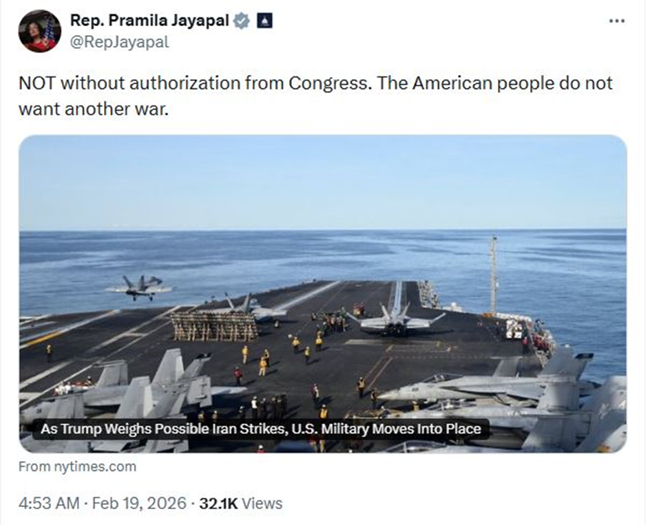 پرامیلا جایاپال نماینده دموکرات ایالت واشنگتن در مجلس نمایندگان آمریکا در واکنش به گزارش نیویورک تایمز درباره تحرکات نظامی آمریکا برای جنگ با ایران، نوشت: «نه بدون مجوز از کنگره. مردم آمریکا جنگ دیگری نمیخواهند.»