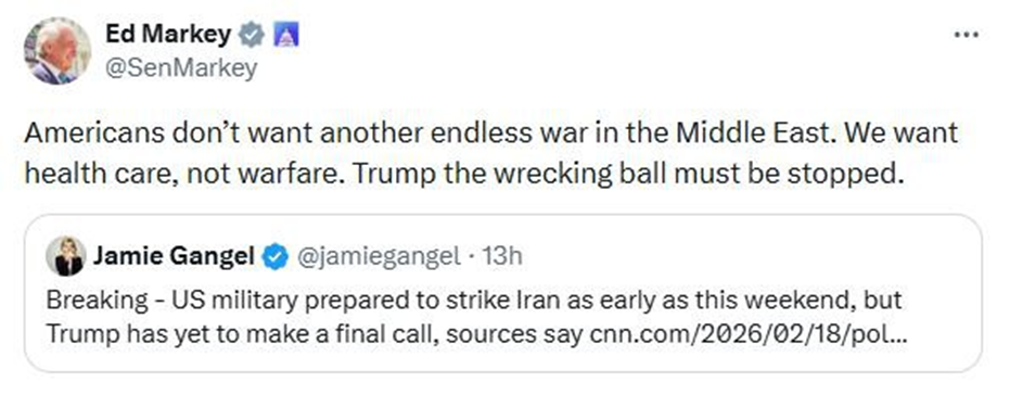 سناتور اد مارکِی نماینده دموکرات ایالت ماساچوست در سنای آمریکا در واکنش به گزارشهایی درباره آمادگی نظامی آمریکا برای حمله به ایران در ایکس نوشت: آمریکاییها جنگ بیپایان دیگری در خاورمیانه نمیخواهند. ما مراقبتهای بهداشتی میخواهیم، نه جنگ. ترامپ این توپ ویرانگر باید متوقف شود.
