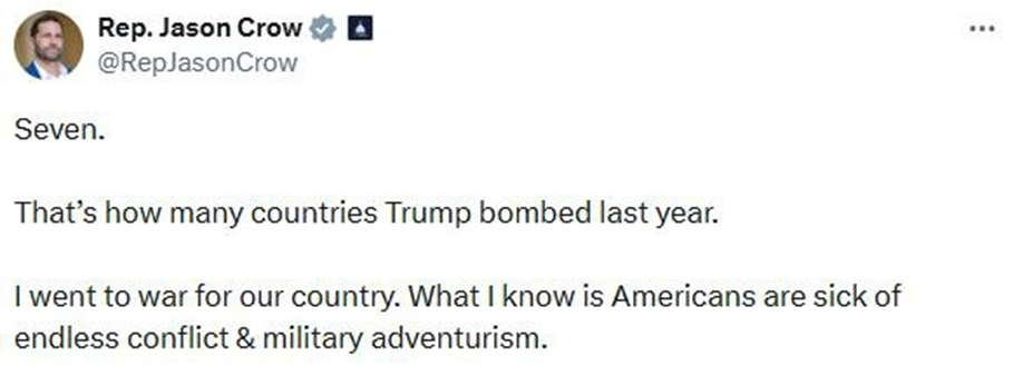 جیسون کرو نماینده دموکرات ایالت کلرادو در مجلس نمایندگان آمریکا، با انتشار پیامی در ایکس اعلام کرد: هفت. این تعداد کشورهایی است که ترامپ در سال اخیر بمباران کرد. من برای کشورم به جنگ رفتم. آنچه میدانم این است که آمریکاییها از منازعات بیپایان و ماجراجوییهای نظامی خسته شدهاند.