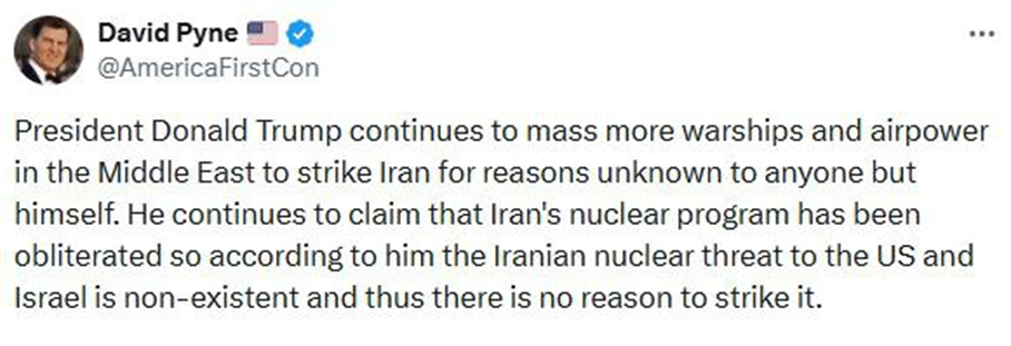 به گزارش خبر ۲۴؛ تعدادی از سناتورها و نمایندگان آمریکایی با انتشار پیامهایی مخالفت خود با سیاستهای جنگطلبانه دونالد ترامپ رئیسجمهوری آمریکا را ابراز کردند.