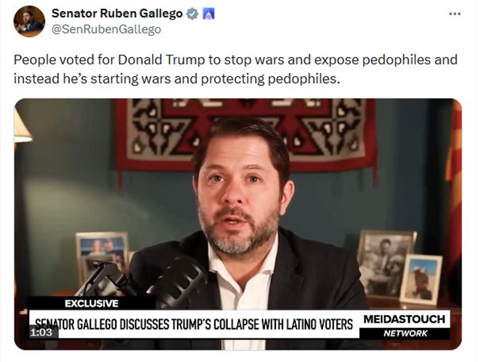 روبن گایگو سناتور دموکرات ایالت آریزونا در سنای آمریکا نیز در ایکس نوشت: مردم به دونالد ترامپ رای دادند تا جنگها را متوقف کند و پدوفیلها (افراد دارای اختلال روانی خطرناک) را افشا کند، اما در عوض او جنگها را شروع میکند و از پدوفیلها محافظت میکند.