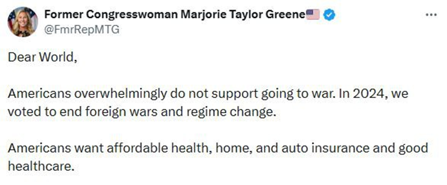 مارجوری تیلور گرین نماینده سابق جمهوریخواه ایالت جورجیا در مجلس نمایندگان آمریکا، در توییتی خطاب به مردم دنیا نوشت: آمریکاییها عموما از رفتن به جنگ حمایت نمیکنند. در سال ۲۰۲۴، ما رای دادیم تا جنگهای خارجی و مداخلههای آمریکا در تغییر حکومتها را پایان دهیم. آمریکاییها بیمه سلامت، خانه و خودرو ارزان و مراقبتهای بهداشتی خوب میخواهند. آمریکاییها میخواهند پدوفیلها و متجاوزان قدرتمند ثروتمند بر دار آویخته شوند، حتی اگر دولت خودمان فرو بپاشد. آمریکاییها شغل خوب با حقوق مناسب و توانایی خرید خانه خوب میخواهند. آمریکاییها فقط معاملات تجاری خوب و صلح جهانی میخواهند، و ما عاشق سفر به بسیاری از کشورهای زیبا هستیم. فقط فکر کردم کسی باید این را خارج از طبقه حاکم ما به شما بگوید.