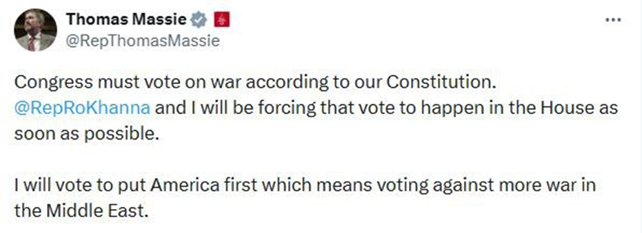 توماس هارولد مسی نماینده جمهوریخواه ایالت کنتاکی در مجلس نمایندگان آمریکا با انتشار پستی در شبکه اجتماعی ایکس نوشت: کنگره باید طبق قانون اساسی ما در مورد جنگ رایگیری کند. من و رو خانا (نماینده دموکرات کالیفرنیا) این رایگیری را در مجلس نمایندگان هرچه زودتر انجام خواهیم داد. من به «اول آمریکا» رای خواهم داد که به معنای رای علیه جنگ بیشتر در خاورمیانه است.
