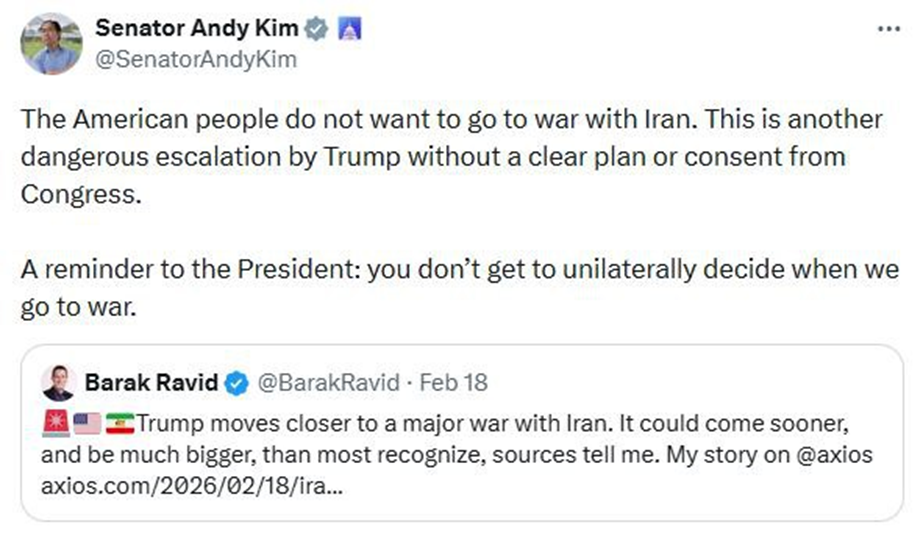 اندی کیم سناتور دموکرات ایالت نیوجرسی در سنای آمریکا در ایکس نوشت: جنگ با ایران چه چیزی برای شما به ارمغان میآورد؟ آیا شما را امنتر میکند؟ آیا پرداخت قبضهایتان را آسانتر میکند؟ آیا شما را نسبت به آیندهتان خوشبینتر میکند؟ ترامپ کشور ما را بدون دلیل، بدون برنامه و بدون توجه به شما به آستانه جنگ میکشاند.